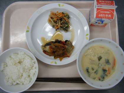 今日の給食は、麦ごはん・牛乳・魚の南蛮漬け・野菜のごまあえ・みそ汁です。