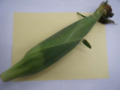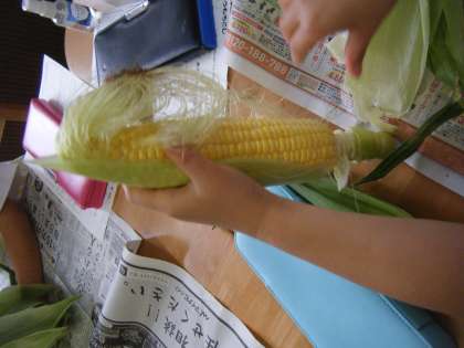 観察をする前に、とうもろこしの旬が「夏」であること、朝に収穫したとうもろこしがおいしいことやひげの数と粒の数が同じであることのお話をすると、興味をもってよく聞いてくれました。実際に触ったり、においをかいでみたり、皮をむく前のとうもろこしをよく観察をしてから皮むきをしました。