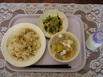 さて、今日のメニューは、子ぎつねごはん、牛乳、さつま汁、野菜のごまだれかけです。