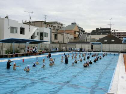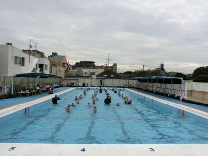 小学校に入って、初めてのプールでの体育です。最初は、控え目ながら歓声も上がっていましたが、あとは話をしっかり聞いて静かに運動しました。今日は、いろいろな動物になりきって水の中を歩いて移動する運動遊びをしました。大きなプールで楽しそうです。