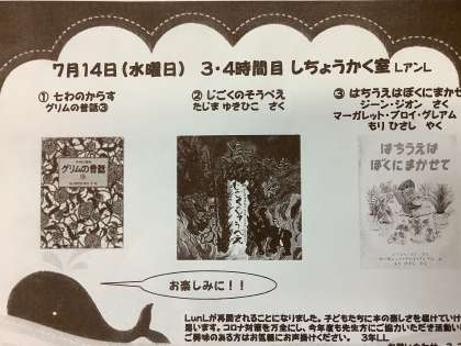 1年生の2月以来ということで、久しぶりのお話会でしたが、本を読んでもらう楽しさを味わうことができました。夏休みにもたくさんの本に触れてほしいです。LアンLのみなさん、ありがとうございました。