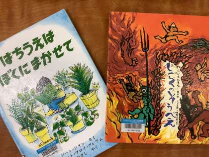 今日はLアンLのみなさんによるお話会でした。『グリムの昔話「七わのからす」』、『じごくのそうべえ』、『はちうえはぼくにまかせて』の3冊を読み聞かせしていただきました。