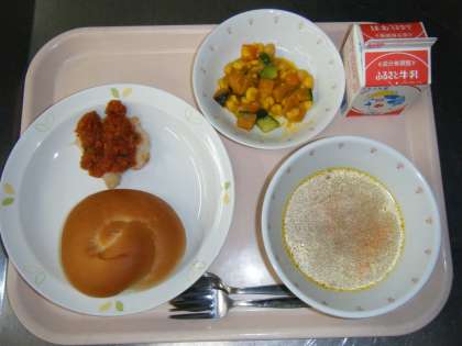 今日の給食は、ミルクパン・牛乳・鶏肉のメキシカンソース・かぼちゃのサラダ・コンソメスープです。