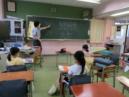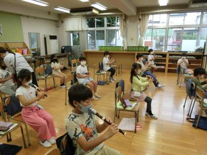 3年生は、Teamsでオンライン授業を行っています。1時間目、1組は音楽です。マスクをしたまま演奏できる塩ビ管を使用して、リコーダーを練習しています。担任は、円滑に進められているか家庭学習の児童の様子を見ています。2組は、国語で、ローマ字の学習をしています。