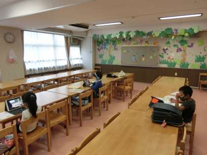 新BOPの指導員とともに、Wi-Fi環境の整ったランチルームに移動し、イヤホンやヘッドホンをして、各学年の学習をしています。