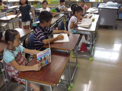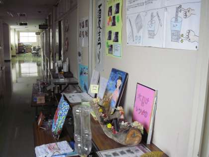 朝読書をしていました。廊下には、“夏休みの自由研究の作品”の展示準備が進んでいます。