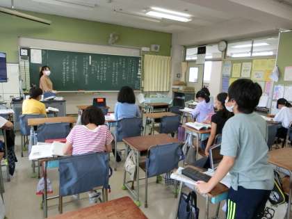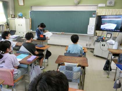 1時間目5年生は、1組国語「新聞を読もう」、2組学級活動「夏休みの自由研究発表会」を行っています。家庭で学習の友達にも、よく見えるようにしています。