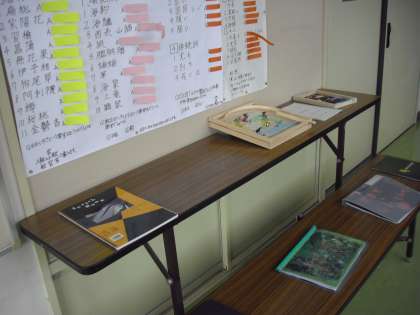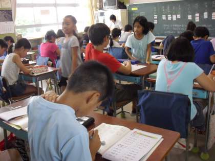 朝の会の前・・・朝自習・・・真剣な子どもの様子・・・教え合う様子です。廊下には、“夏休み自由研究の作品”を準備・・・。