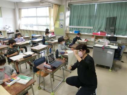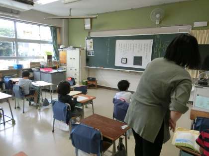 1時間目1年生は、両組とも国語「いちねんせいのうた」の学習です。家庭から、先生に質問もできています。