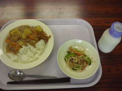 今日の献立は、カレーライス、牛乳、福神漬け、こんにゃくサラダです。