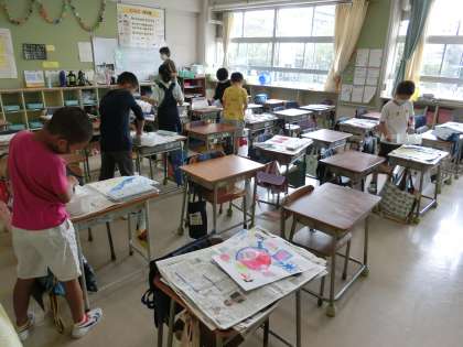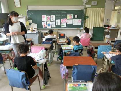 2年生は、2時間目1.2組とも図画工作です。「大きく育て びっくりやさい」絵の具を使って、思い思いのびっくり野菜を描きました。Aグループは、昨日行っています。