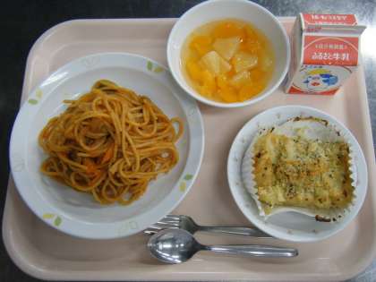 今日の給食は、スパゲティナポリタン・牛乳・ポテトクリーム焼き・フルーツポンチです。