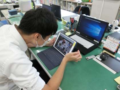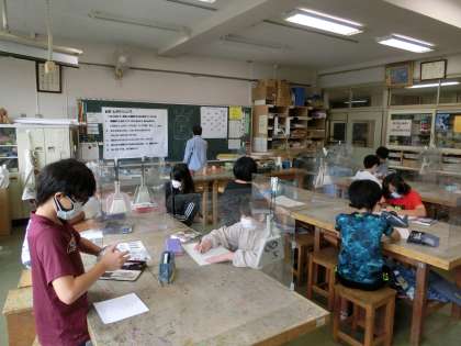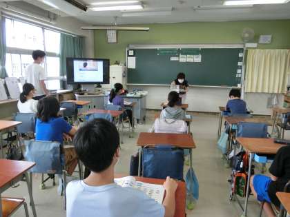 6年生は1時間目1組は、外国語「My summer vacation.」の学習です。夏休みに行った場所や食べ物、楽しんだこと、感想などを伝え合いました。2時間目2組は、図画工作「ヒカリノハニワ」 粘土で、中に電球が入るようにして光る埴輪をつくります。担任の先生は職員室で、家庭で学習している児童たちからの質問に答えています。