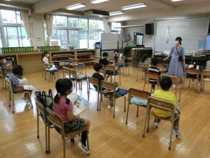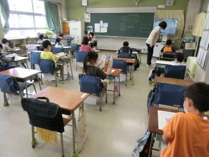 分散登校5日目、Aグループの登校です。3時間目、1年1組は音楽「どれみとなかよくなろう」『ひのまる』の学習です。2組は図画工作「のはらのだいぼうけん」「うみのだいぼうけん」自分の手形を使って、動物や魚を表現していきます。今日はその下書きを行いました。