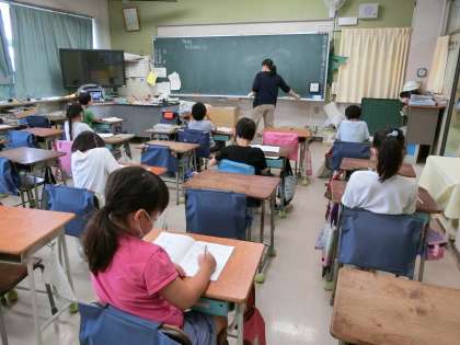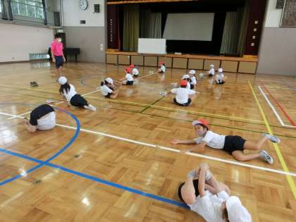 2年生は、3時間目1組は算数「水のかさ」の確かめを行いました。2組は体育「多様な動きをつくる運動遊び」です。足の裏を合わせて座った姿勢のまま、転がって起きる運動をしています。