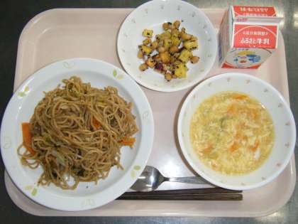 今日の給食は、ソース焼きそば・牛乳・お豆かりんとう・中華風コーンスープです。
