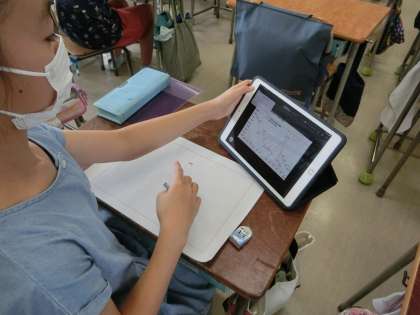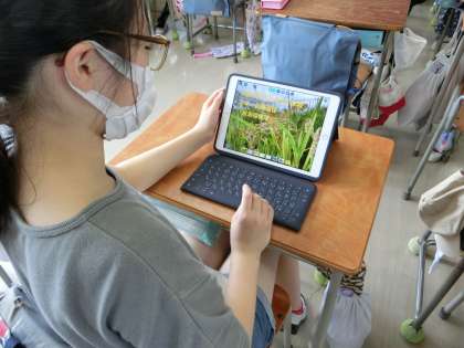5、6時間目、1組も2組も総合的な学習の時間「米米探検隊(田んぼを作ろう)」の学習です。分散登校時に、稲刈りを終えたBグループの児童は、米作りについて、タブレットを活用してまとめています。