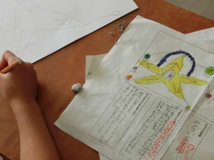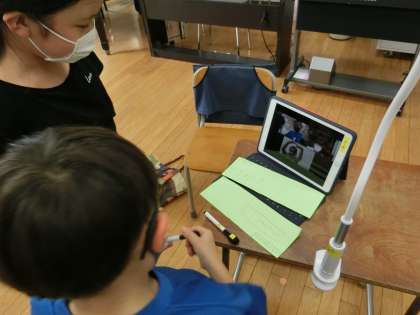3,4時間目、1組国語「あったらいいなこんなもの」の学習です。みんなに発表するために、画用紙に大きく絵をかいています。5時間目、2組音楽「さがしてつくろう」身近な生活の中で聞こえる音を声で表現して、グループの友達と音楽を作りました。家庭で学習している友達とも、オンラインで相談しながら進めています。