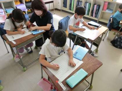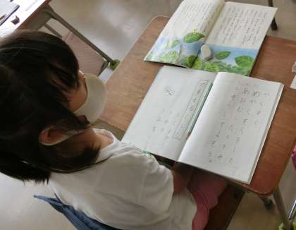 1組、4時間目算数、単元学習の他に引き算の練習をしています。2組、5時間目国語「やくそく」約束をする三匹の青虫の気持ちや様子を想像して読みました。
