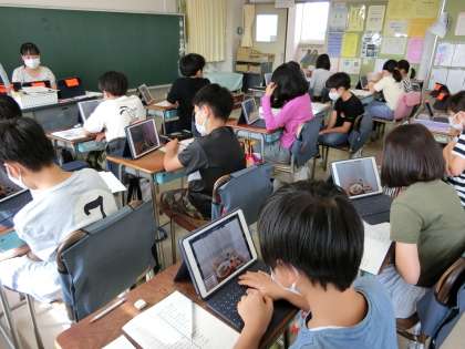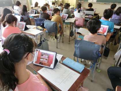 5.6時間目、1,2組とも総合的な学習の時間です。「川場移動教室」に向けて、タブレットを活用して、川場や施設の様子等の写真を見ながら、ねらいや、活動内容の説明を聞き、うれしそうな声があがっていました。