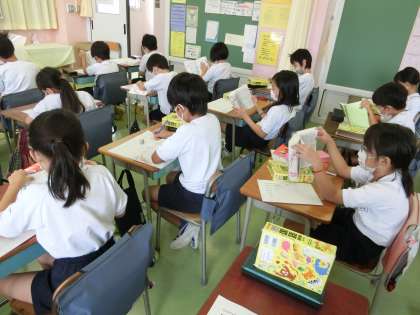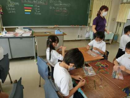 1組、3時間目算数「三角形」の学習です。4種類の色棒を使って、いろいろな三角形を作りました。2組、3時間目国語「ちいちゃんのかげおくり」3場面までの出来事やちいちゃんの気持ちを読み取りました。また、難しい語句は国語辞典で調べました。