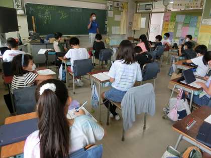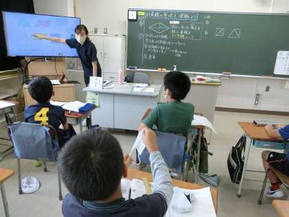 1組、4時間目社会「自然災害からくらしを守る」の学習です。映像を視聴し、地震からくらしを守る取り組みを調べました。2組、3時間目算数「垂直、平行と四角形」で、対角線の意味を学習しました。