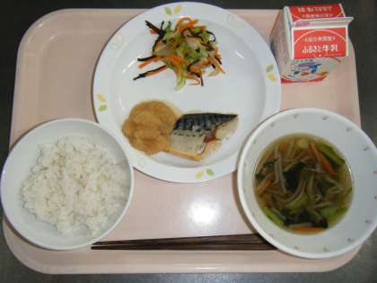 今日の給食は、麦ごはん・牛乳・魚の塩焼き・沢煮椀・野菜の塩こんぶかけです。
