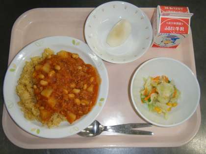今日の給食は、チリビーンズライス・牛乳・コーンサラダ・くだもの(なし)です。