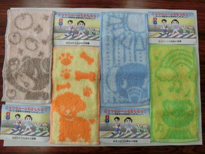 また本日、本校PTA 校外委員会より児童に、交通安全啓発グッズが配られました。他にも郊外委員中心に、通学路で黄色の横断旗を持ち、安全を見守ったり、通学路の安全点検などを一緒に行ったりしていただいています。