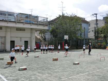 3時間目体育、1組は体育館、2組は校庭で「走・跳の運動遊び」を行いまいました。フラフープで縄跳びのように跳んだり、ミニハードル、段ボール箱をリズミカルに跳び越したりしました。小1サポーターの方も助けてくださいました。