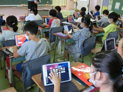 1組は、4時間目学級活動です。他学年の夏休みの自由研究を見て回りました。2組は、3時間目国語「ローマ字」の学習です。テーマを決めて、タブレットに書き込んでいきました。