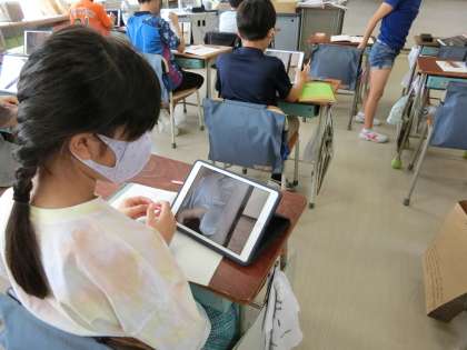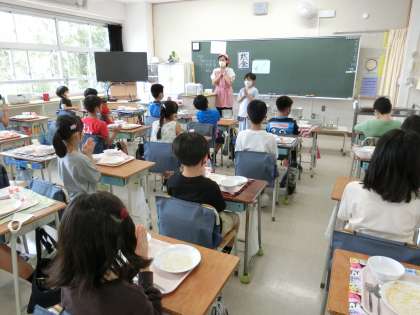 1組は、3時間目理科「自然の中の水」の学習です。空気中の水蒸気について、ロイロノートを使い、友達が送ってくれた写真を基に考えました。2組は、給食の時間です。ちょうど食べ終わり、ごちそうさまの挨拶です。