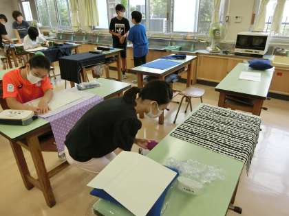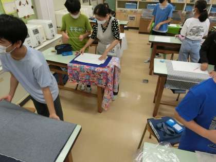 1組、3、4時間目家庭「思いを形にして生活を豊かに」の学習です。生活を豊かにするための布を用いたもの(クッション)を製作します。みんな思い思いの布を持ち寄り、クッション作りが始まりました。