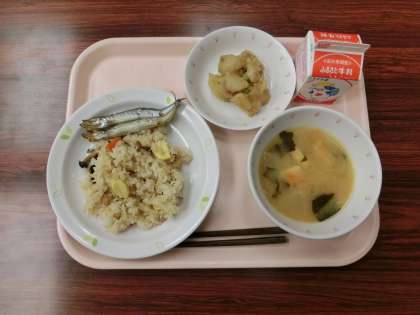 今日の給食は、秋の香りごはん・牛乳・焼きししゃも・じゃが芋のそぼろ煮・みそ汁です。