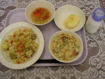 今日のメニューは、パエリア、牛乳、卵スープ、くだものです。今日もアレルギー対応食を調理員さんが作ってくれました。後ろのスープがそうです。
