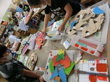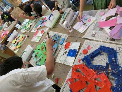 2組、1,2時間目図画工作「ゆかいなトンギコの顔」です。昨日の1組と同じように、ずいぶん出来上がってきました。みんな楽しそうです。