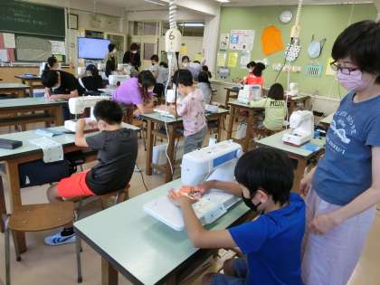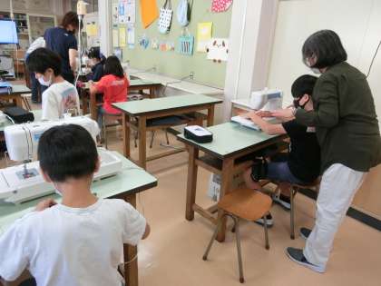 2組、1,2時間目家庭「ミシンにトライ!手作りで楽しい生活」の学習です。最初にミシンで練習布を縫いました。そのあとは、エプロンの型紙に沿って布を裁ちました。ボランティアの皆さんがいてくださり、心強いです。