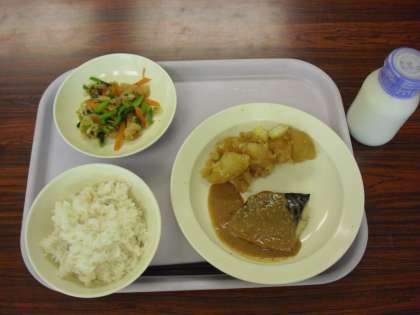 今日の献立は、ご飯、牛乳、魚のごまだれかけ、じゃが芋の甘辛煮、カリカリ油揚げと野菜のひたしです。