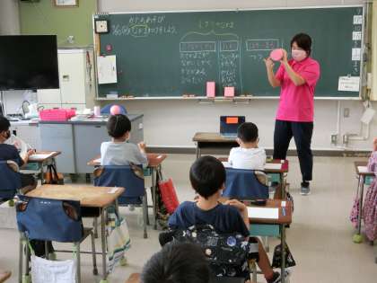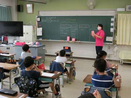 1組は、5時間目算数「かたちあそび」です。いろいろな箱などの具体物を観察して、形の特徴を確認し分類しました。