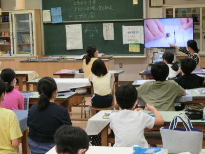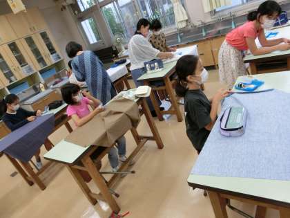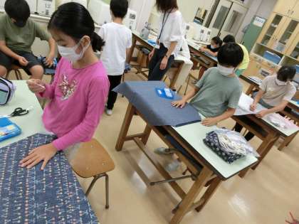 1組、3,4時間目家庭「ミシンにトライ!手作りで楽しい生活」の学習です。型紙に沿って裁断した布でエプロン作りに取りかかりました。アイロンの扱い方も練習しました。そのあとは、ミシンの下糸の付け方をビデオを見て学び、ミシンで練習布を縫ってみました。