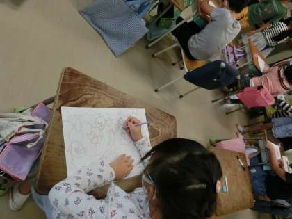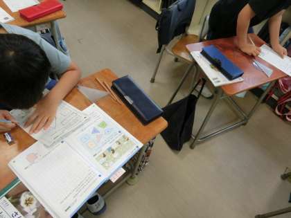 1組、2時間目図画工作「ゆめのくにへようこそ」の学習で、作品作りの計画を立てました。2組、2時間目算数「三角形と四角形」です。方眼を使って、長方形、正方形、直角三角形の作図を学習しました。