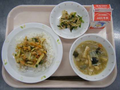 今日の給食は、かきあげ丼・牛乳・みそ汁・おひたし(菊花)です。