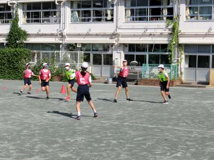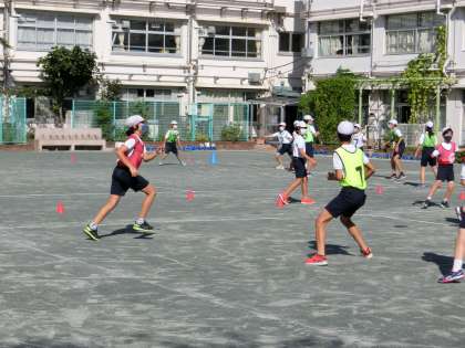 1組は、1時間目体育「アルティメット」です。チーム練習をしたあと、試合を行いました。