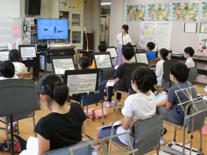 2組は、5時間目音楽「風を切って」の学習です。氷河の様子やその過酷さを感じ取り、曲想につなけられるように、映像を見ながら、音楽を聞きました。