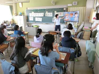 2組は外国語活動「He can run fast.」「She can do kendama.」で、スポーツの動作の言い方に慣れ、アニメーションの話の概要をつかみました。