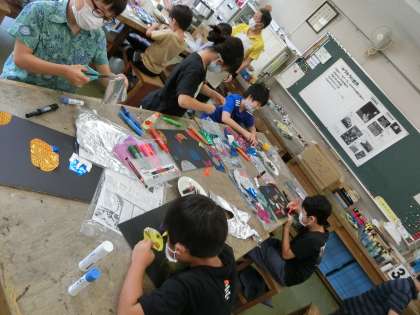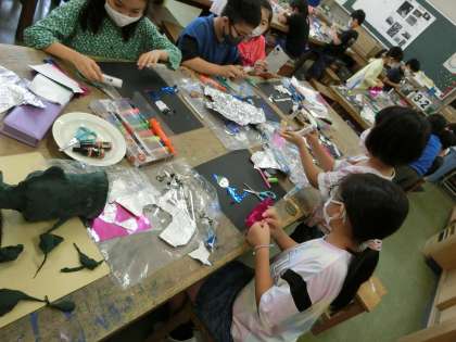 図画工作「キラキラの世界」です。光る材料を切り張りして、宇宙の○○を作り始めました。