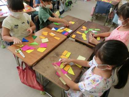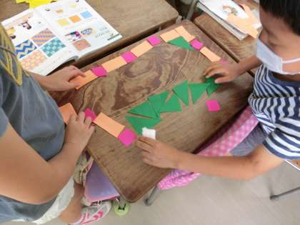 1組、5時間目算数「三角形と四角形」の学習で、きれいな模様を作りました。このような活動を通して、図形についての感覚を豊かにしていきます。