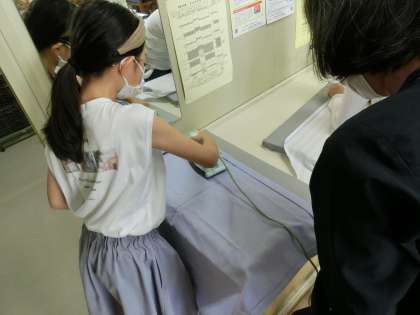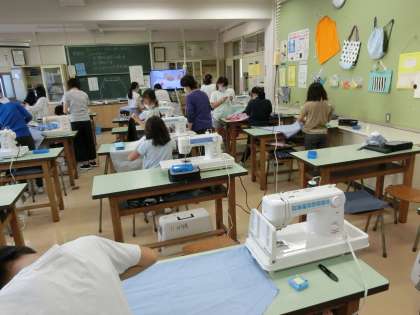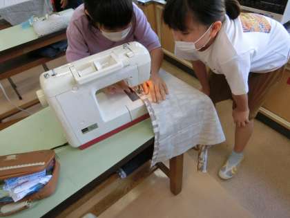家庭「ミシンにトライ!手作りで楽しい生活」です。アイロンの扱い方にも慣れてきました。ミシンの上糸のかけ方を理解し、エプロンの上と下の部分を縫いました。