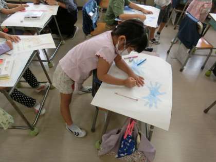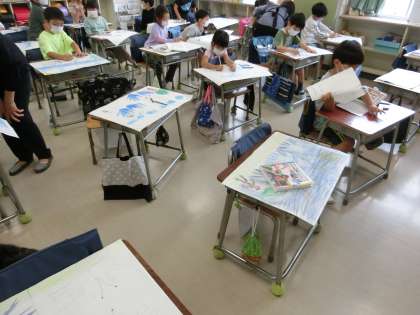 1組、図画工作「うみ・のはらのだいぼうけん」です。下書きをしてイメージを固め、手形の場所や色を考えました。