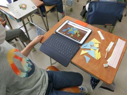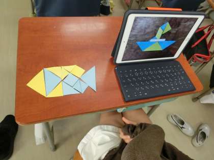 1組、算数「三角形と四角形」の発展的な学習で、タングラムを行いました。それぞれの形を組み合わせて、いろいろなものを作りました。